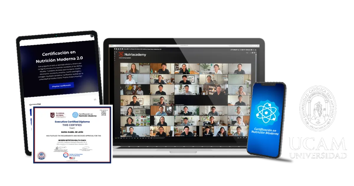Certificación oficial como Modern Nutrition Health Coach avalada por Florida Global University y certificada por CEL (al aprobar el examen).